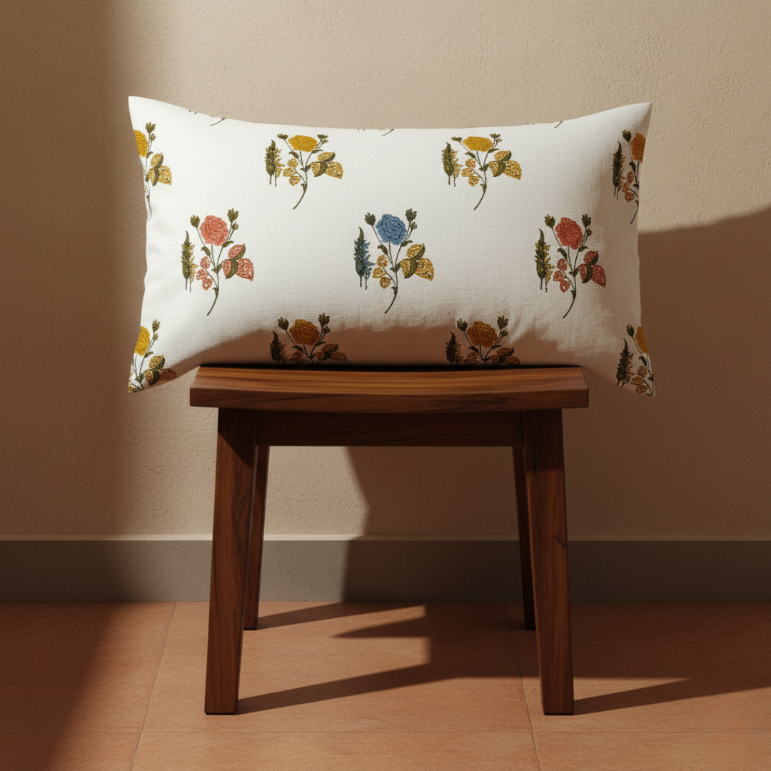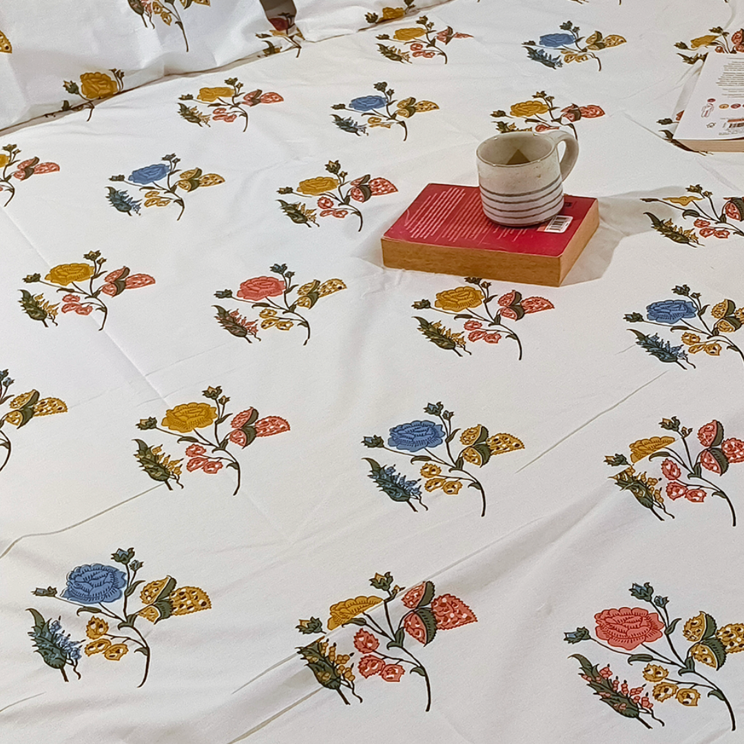 Bold Yet Balanced: A lively mix of orange, mustard, and dusty blue rose motifs on a crisp white base — striking without overwhelming