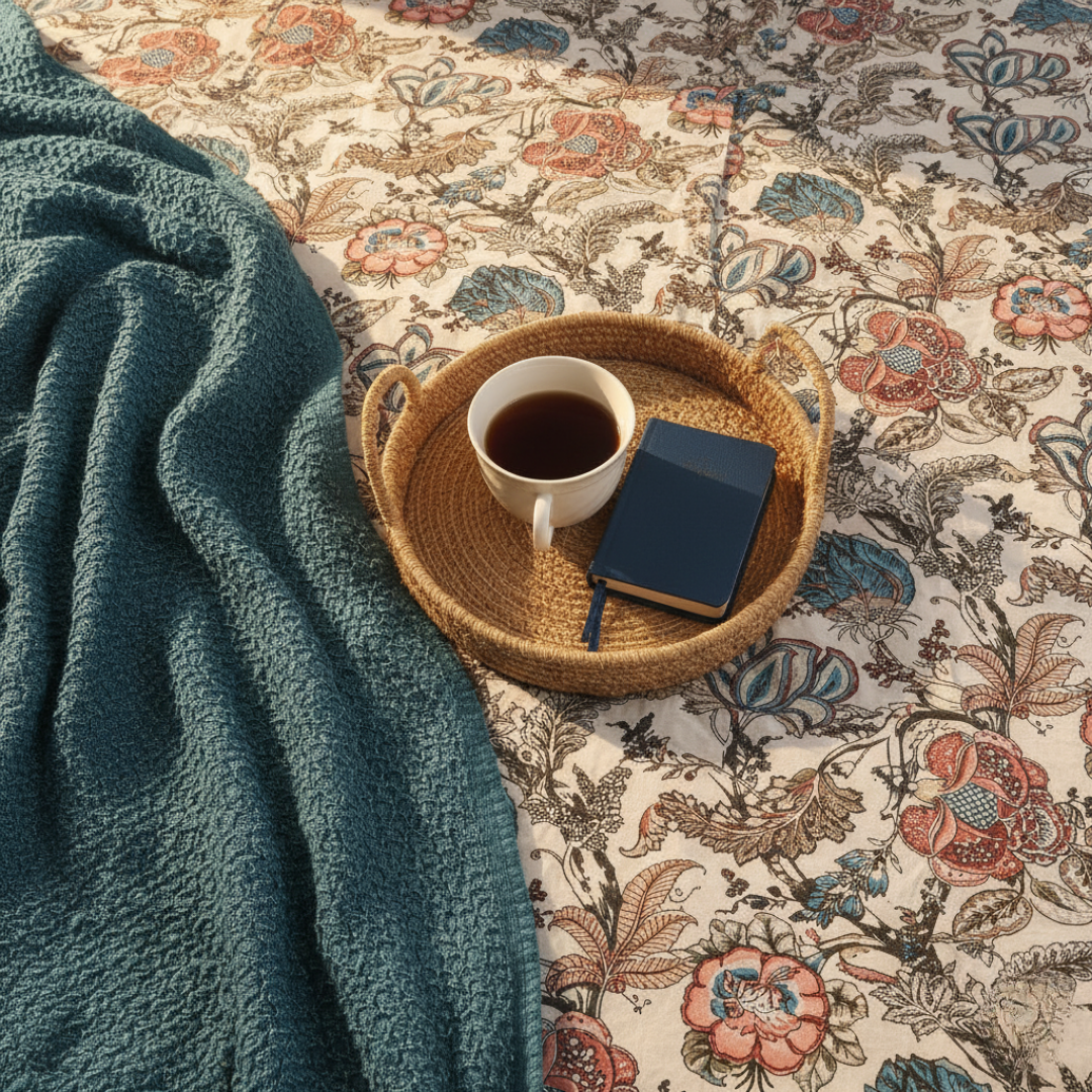 Timeless & Versatile: A calm beige base with detailed blue floral prints — an elegant blend that suits both classic and modern bedrooms
